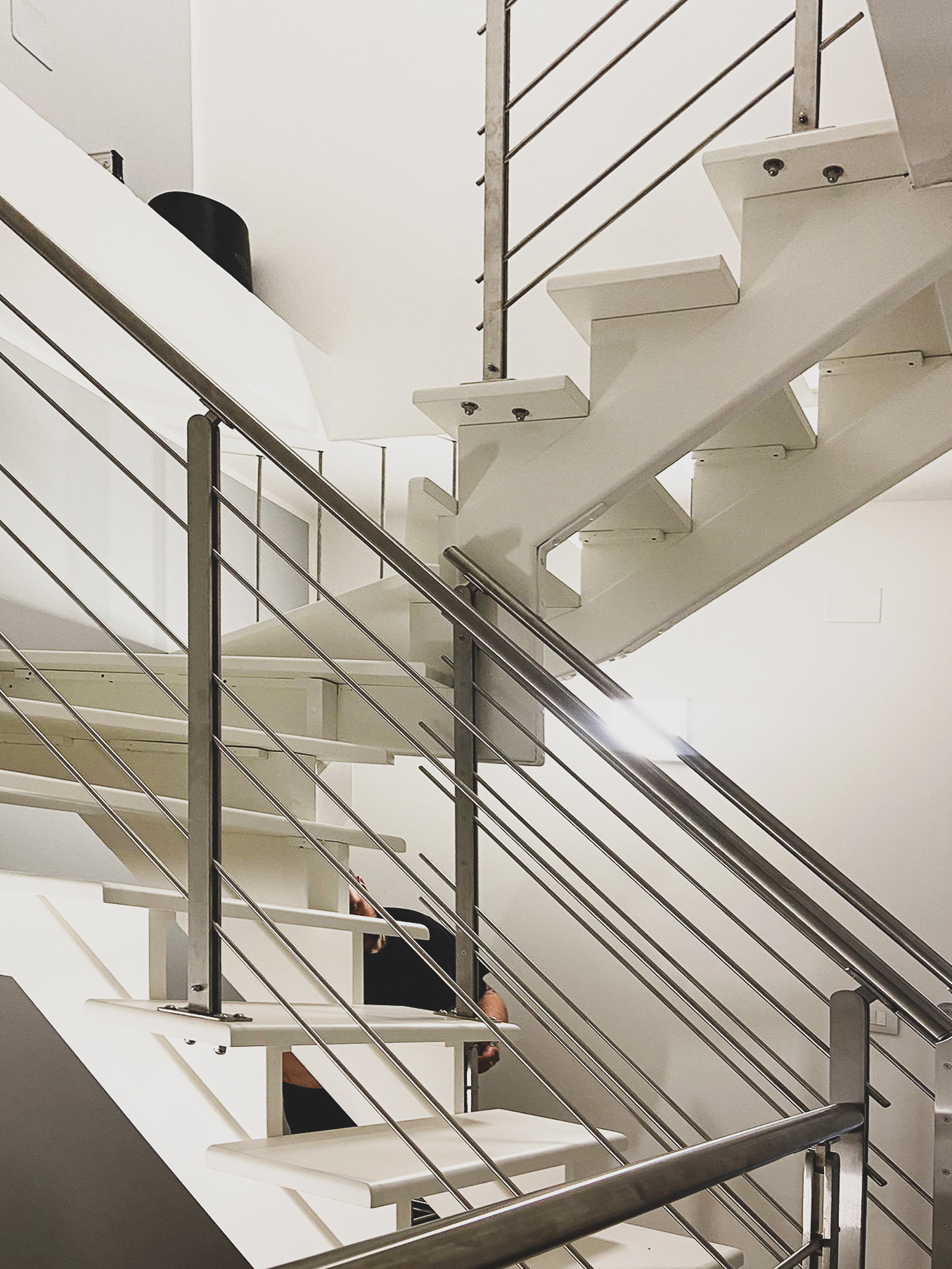 Rilievo, creazione modello virtuale 3d, produzione in capannone degli elementi separati della scala a chiocciola, verniciatura in forno, trasporto, posa in opera, rifiniture in loco.