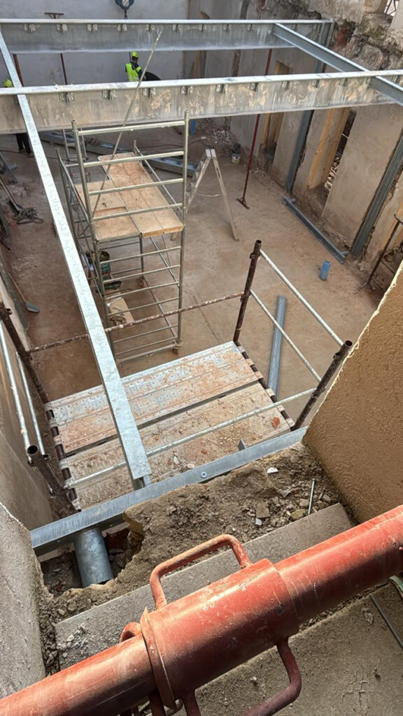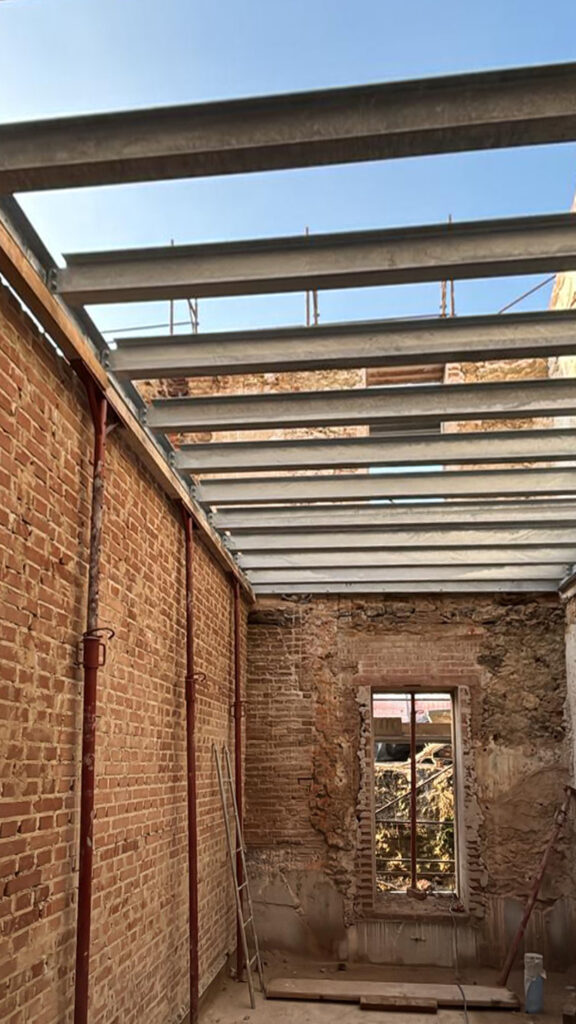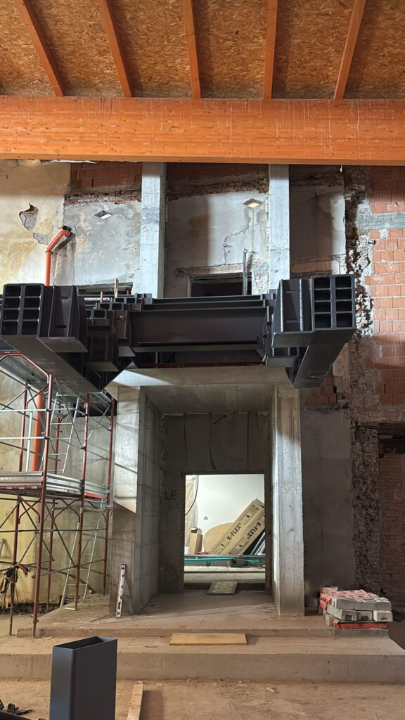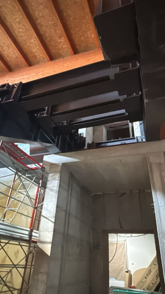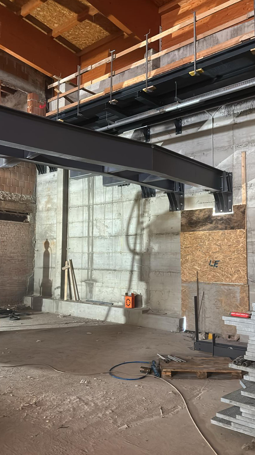 Per il cantiere sono state disegnate e prodotte e successivamente installate, strutture portanti in travi di acciaio per scale e solai. Gli elementi prodotti in capannone, sono stati successivamente trasportati e posati in opera, li poi sono state effettuate le ultime finiture.